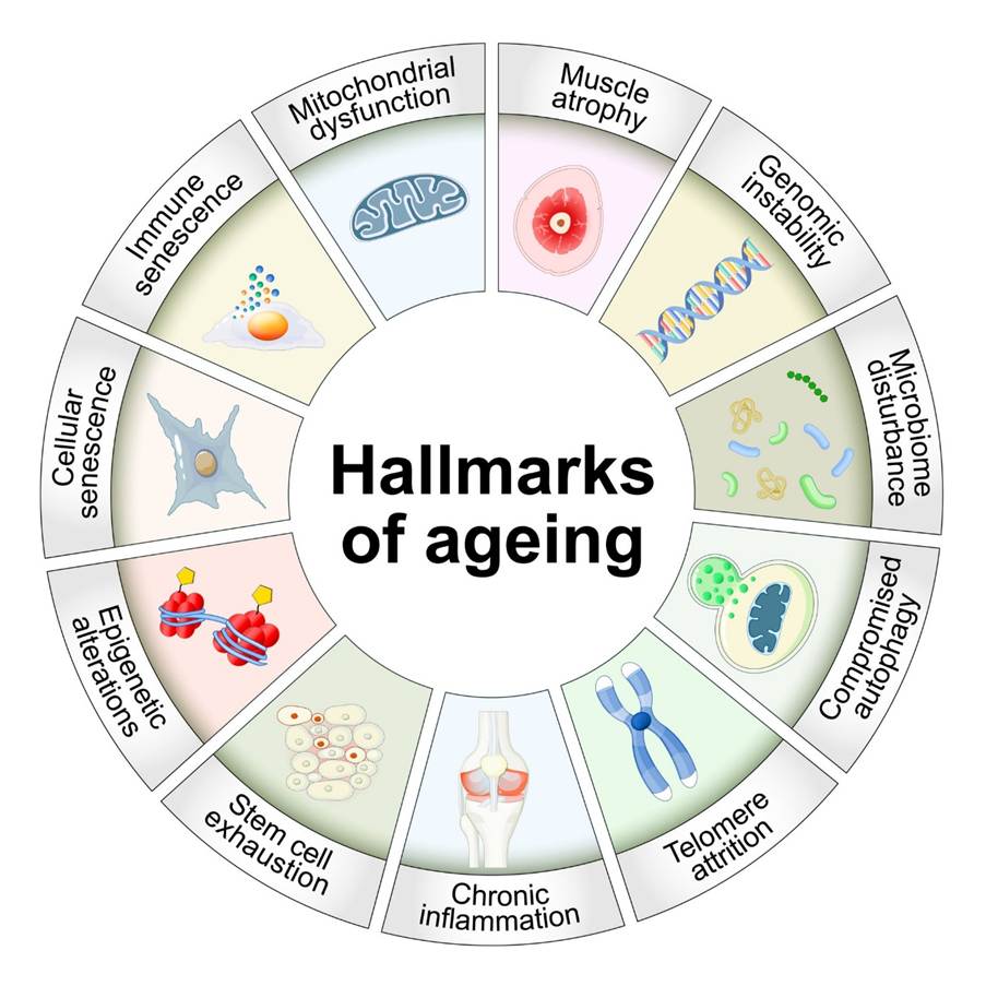 유전적 불안정성, 텔로미어 마모, 후성유전학적 변화, 단백질 항상성 상실, 영양소 감지 체계 교란, 미토콘드리아 기능 부전, 세포 노화, 줄기세포 고갈, 세포 간 통신 변화는 여전히 노화 연구의 중심축이다.